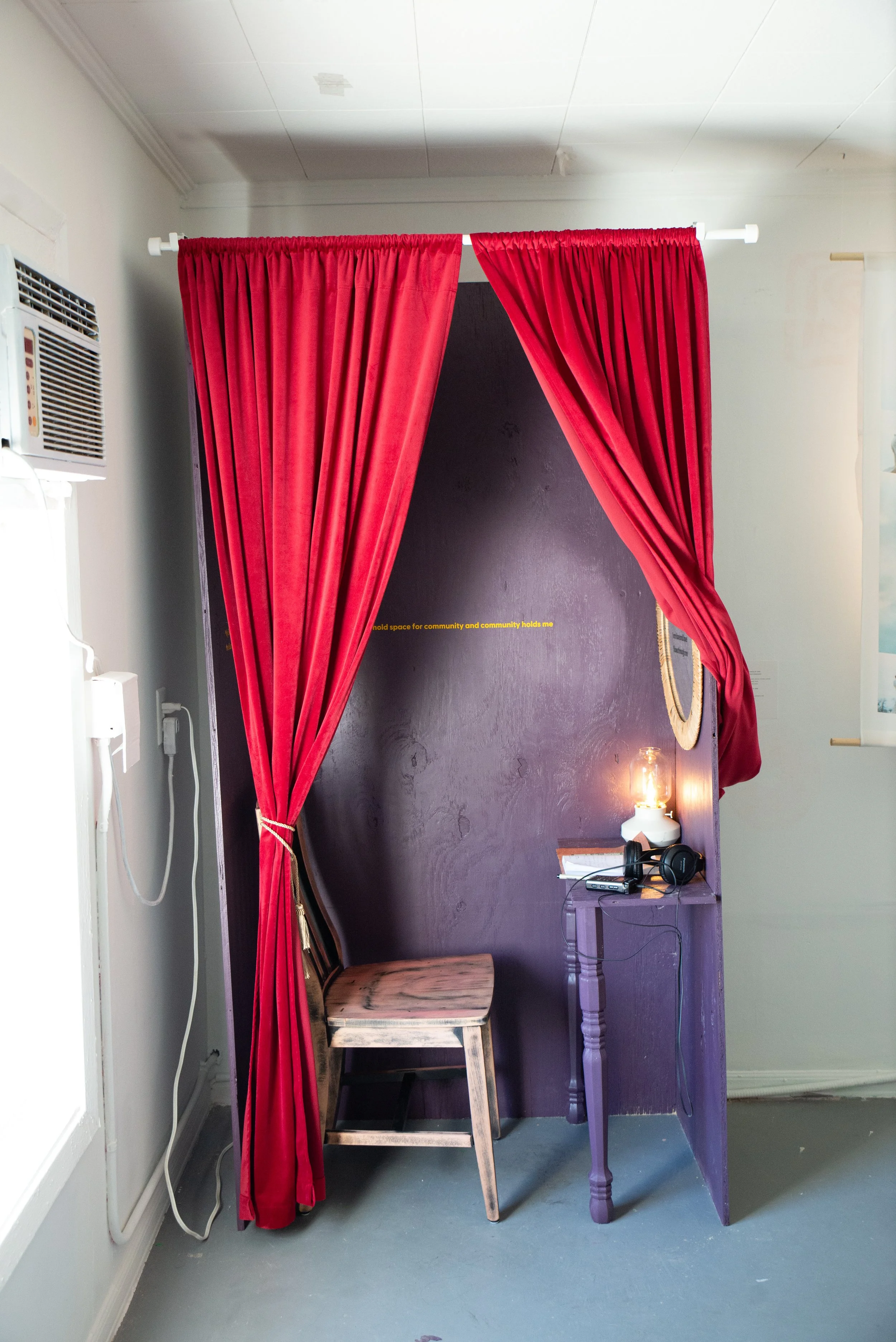 Installation inspired by the somatic symbols of a Catholic service including a constructed wooden booth with prompts for affirmation and reflection, a community rosary, a found and refinished wooden pew and wired organ speakers.